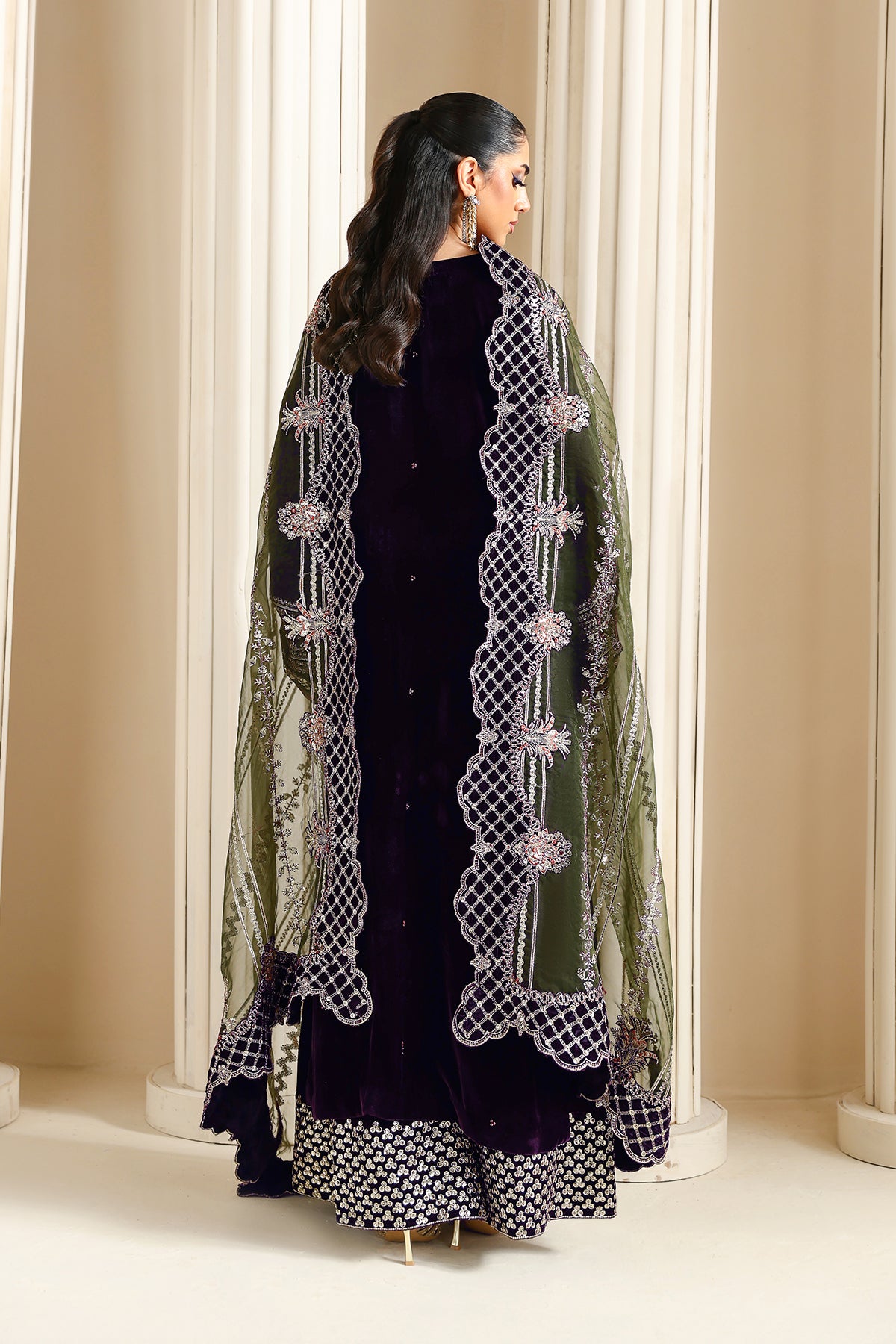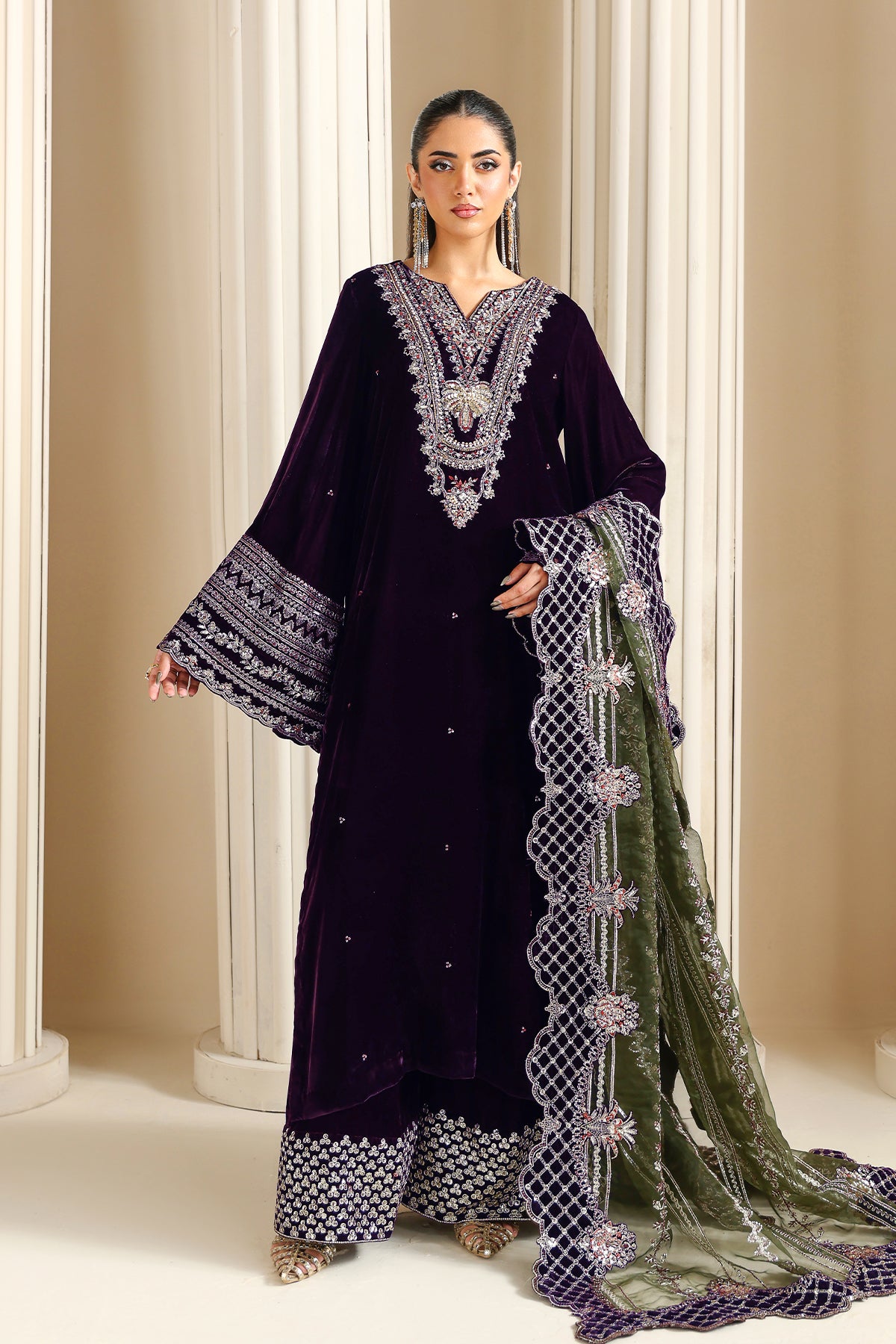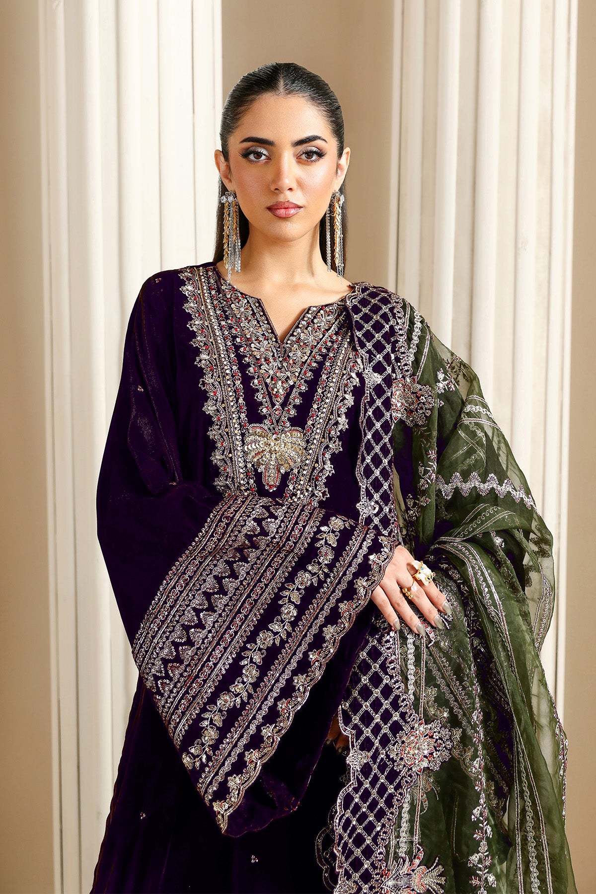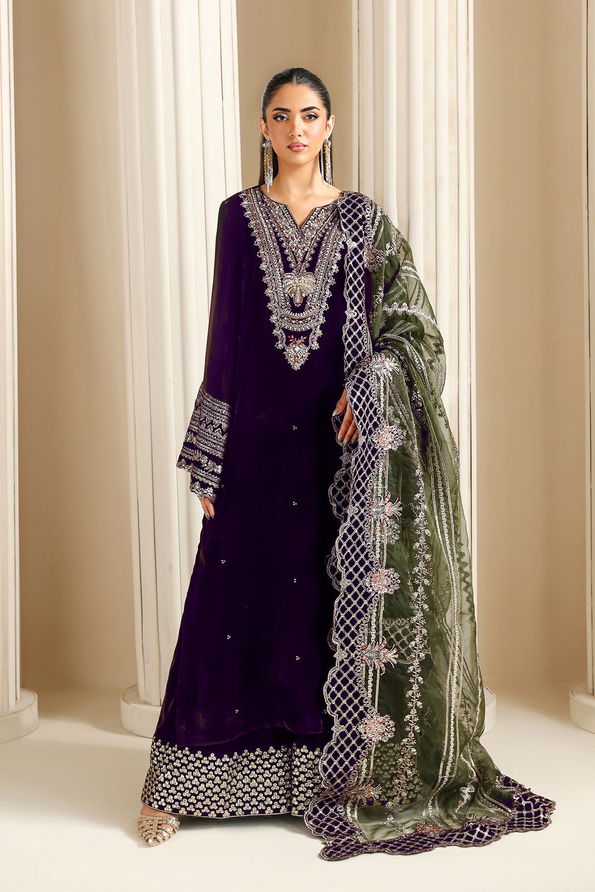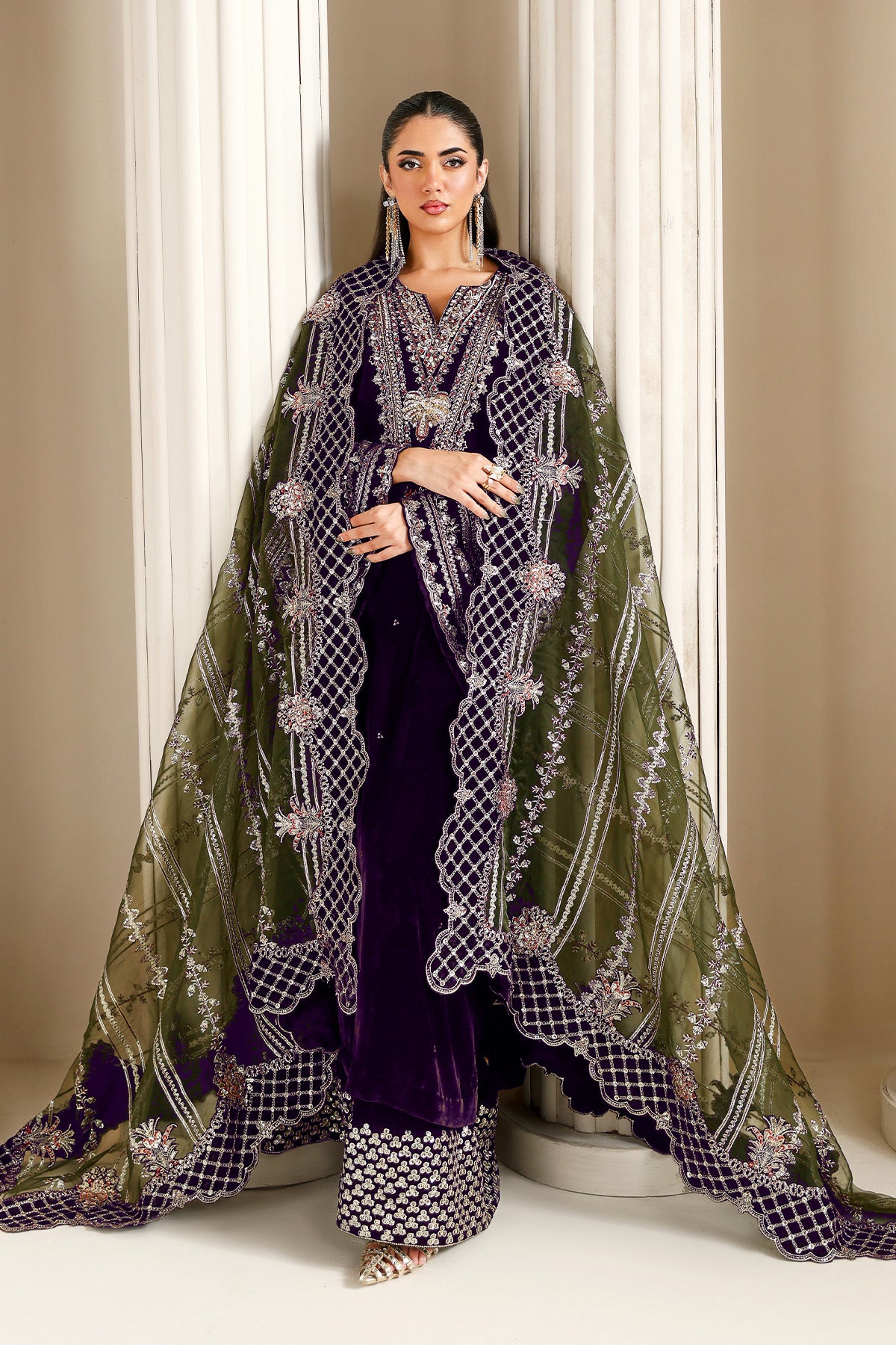 Ensemble crafted from rich velvet, adorned with a handmade and intricately embroidered front neck that highlights fine craftsmanship. The outfit is paired with a dyed velvet trouser detailed with delicate patterns for a cohesive finish. An embroidered organza dupatta, accentuated with ornate borders and motif work, adds textural contrast and depth. Designed in a straight long silhouette, this look combines traditional detailing with a structured yet graceful appearance.