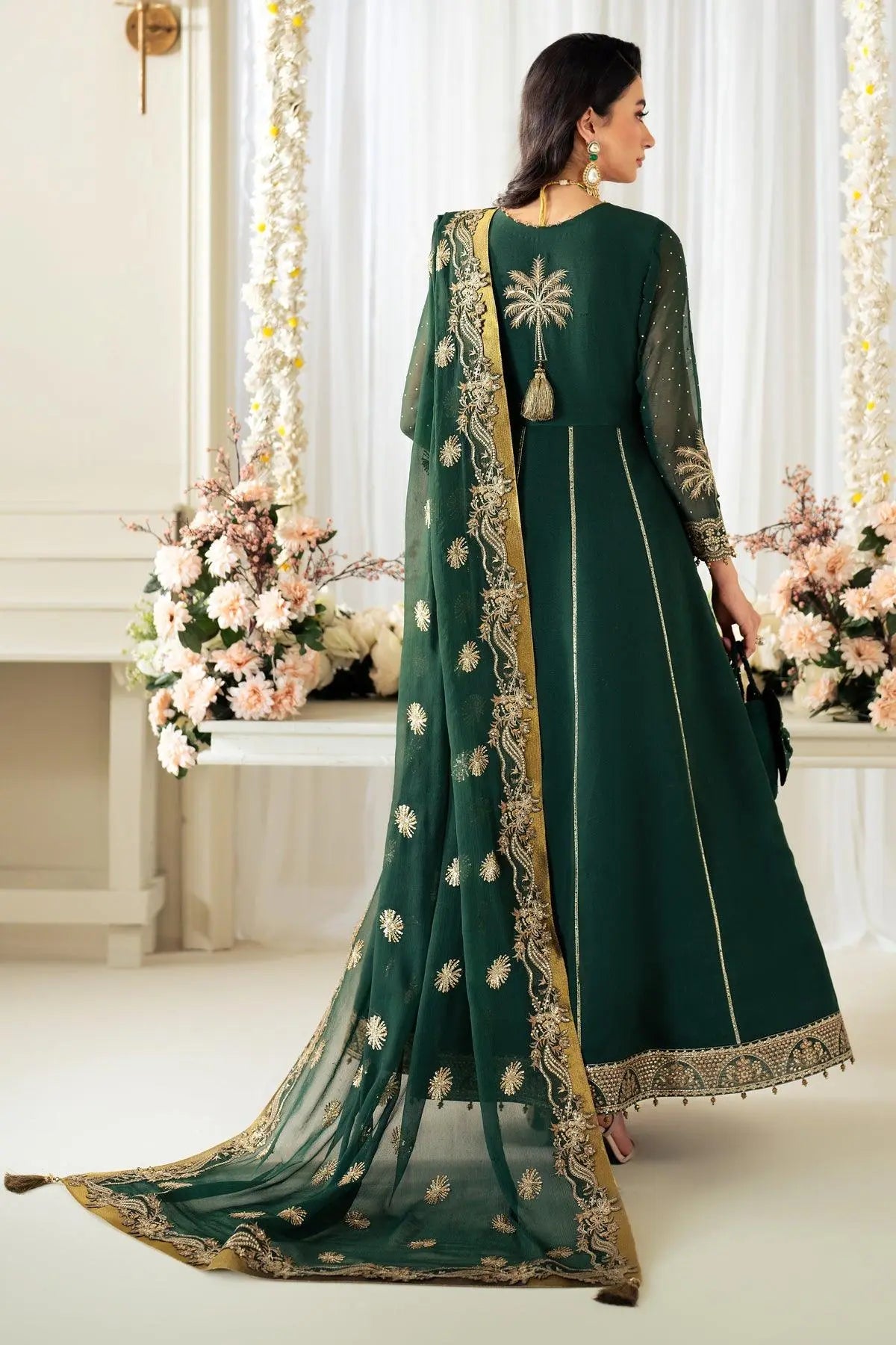 The "Citrus" ensemble in bottle green exudes refined elegance, featuring intricate embroidery on a luxurious embellished chiffon base with vivid floral motifs. The finely crafted neckline, accented with gold embroidery, brings an added layer of sophistication. Paired with a chiffon dupatta showcasing a delicately embroidered border and Russian grip trousers, this outfit completes a stunning, formal look.