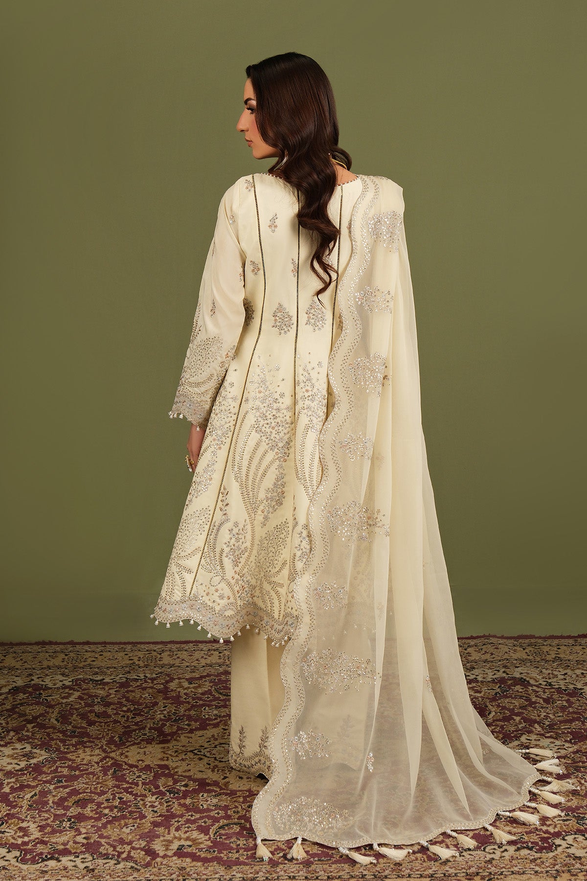 Intricate embroidery adorns the front of the shirt, featuring delicate floral and vine motifs enhanced with fine detailing that adds depth. The straight-cut trousers are tailored with a minimal finish, creating a balanced silhouette that complements the detailed craftsmanship of the shirt.