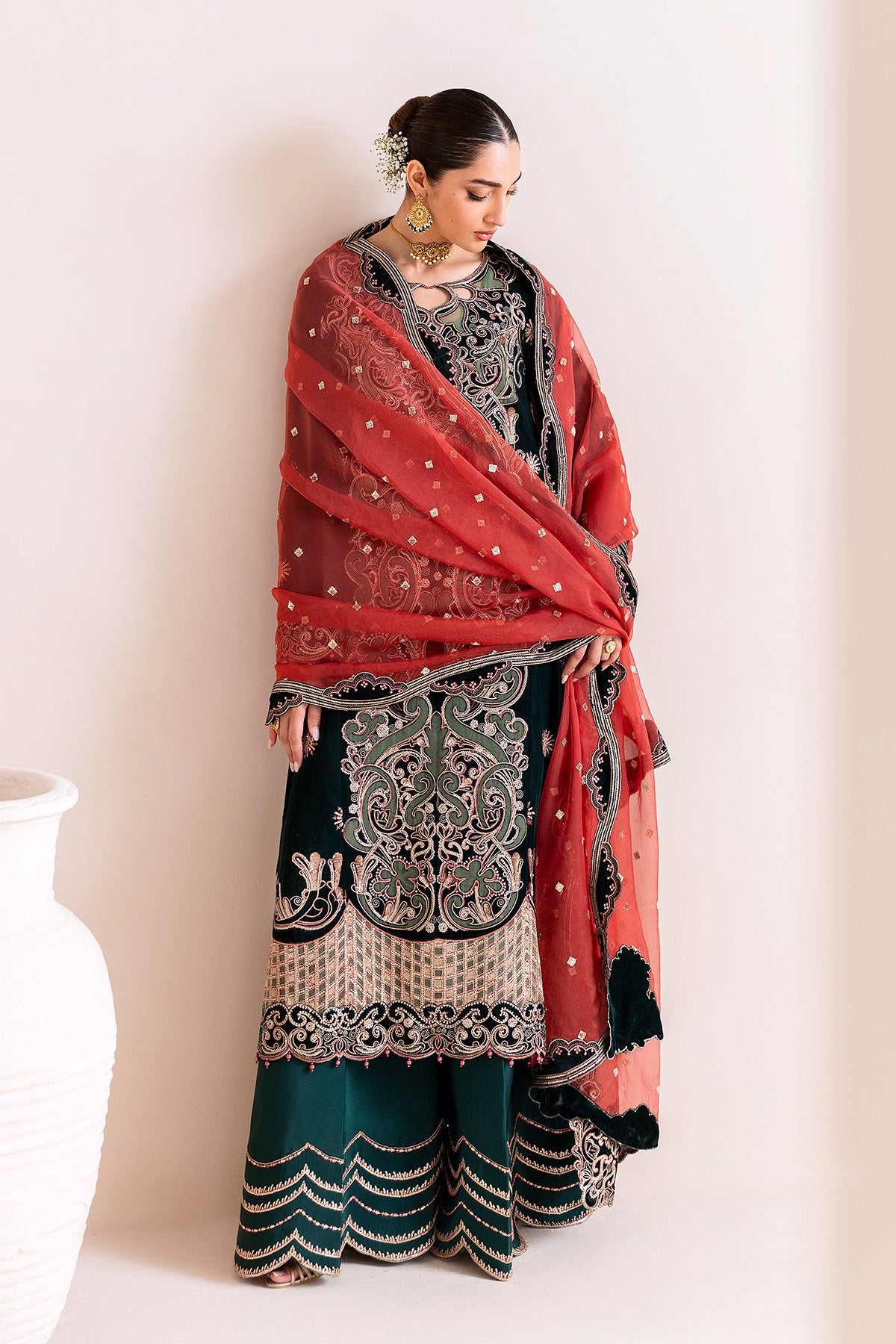 The ensemble features a deep emerald green straight-cut kameez with an intricately embroidered front kali and organza front neck applique. It is paired with a dyed Russian grip trouser, enhanced with an embroidered border. The look is completed with a contrasting rust-red organza dupatta adorned with delicate embroidery and a beautifully detailed border, creating a rich and sophisticated outfit perfect for festive occasions.