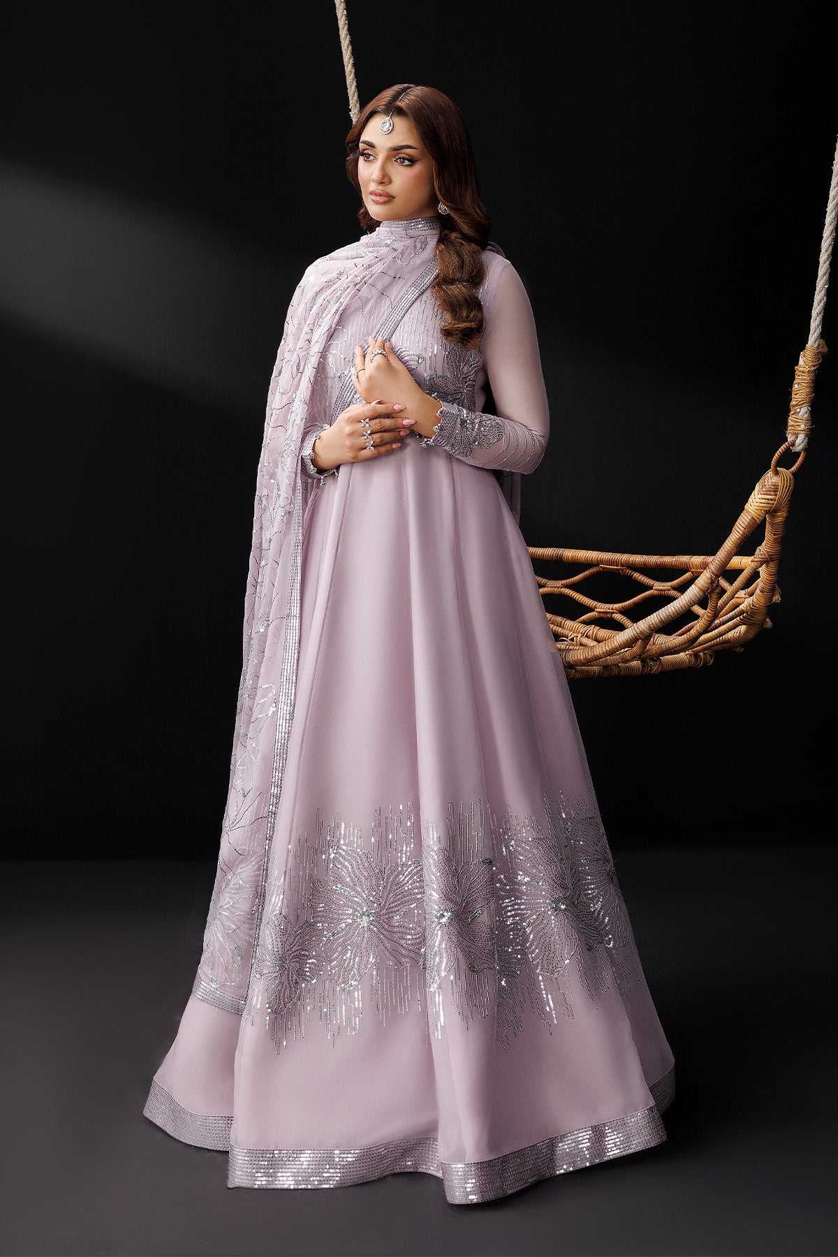Crafted with a fitted bodice flowing into a flared silhouette, the design features detailed embroidery at the neckline, cuffs, and lower hem. A matching dupatta completes the look, finished with coordinated embroidery along the borders.