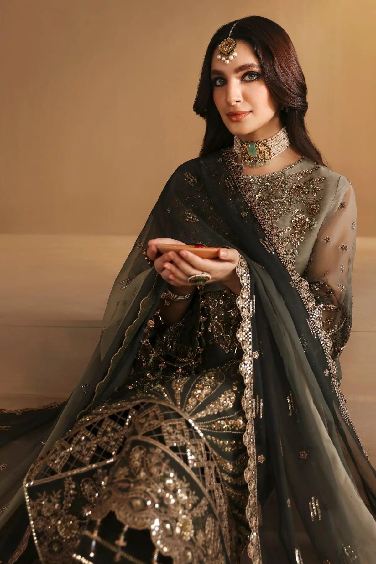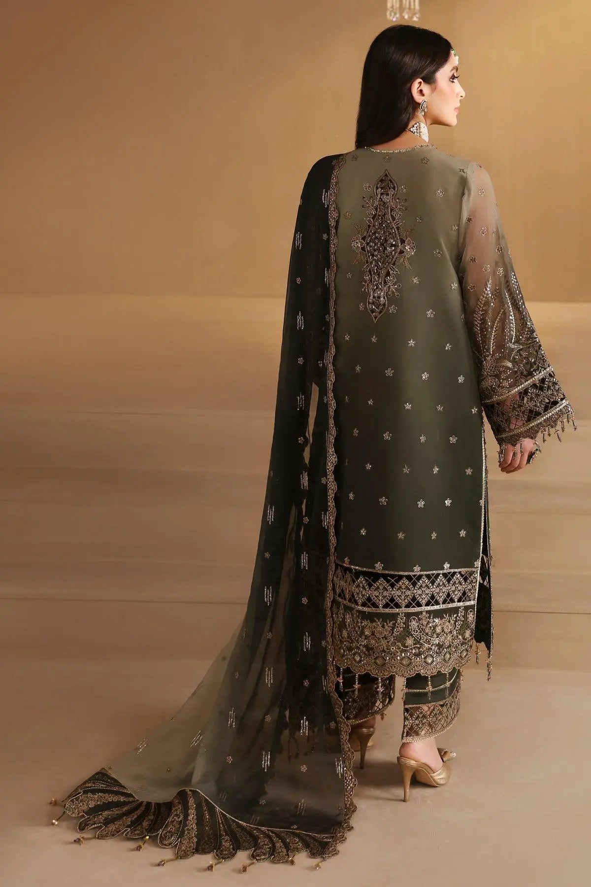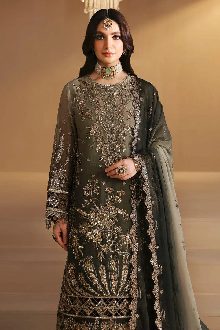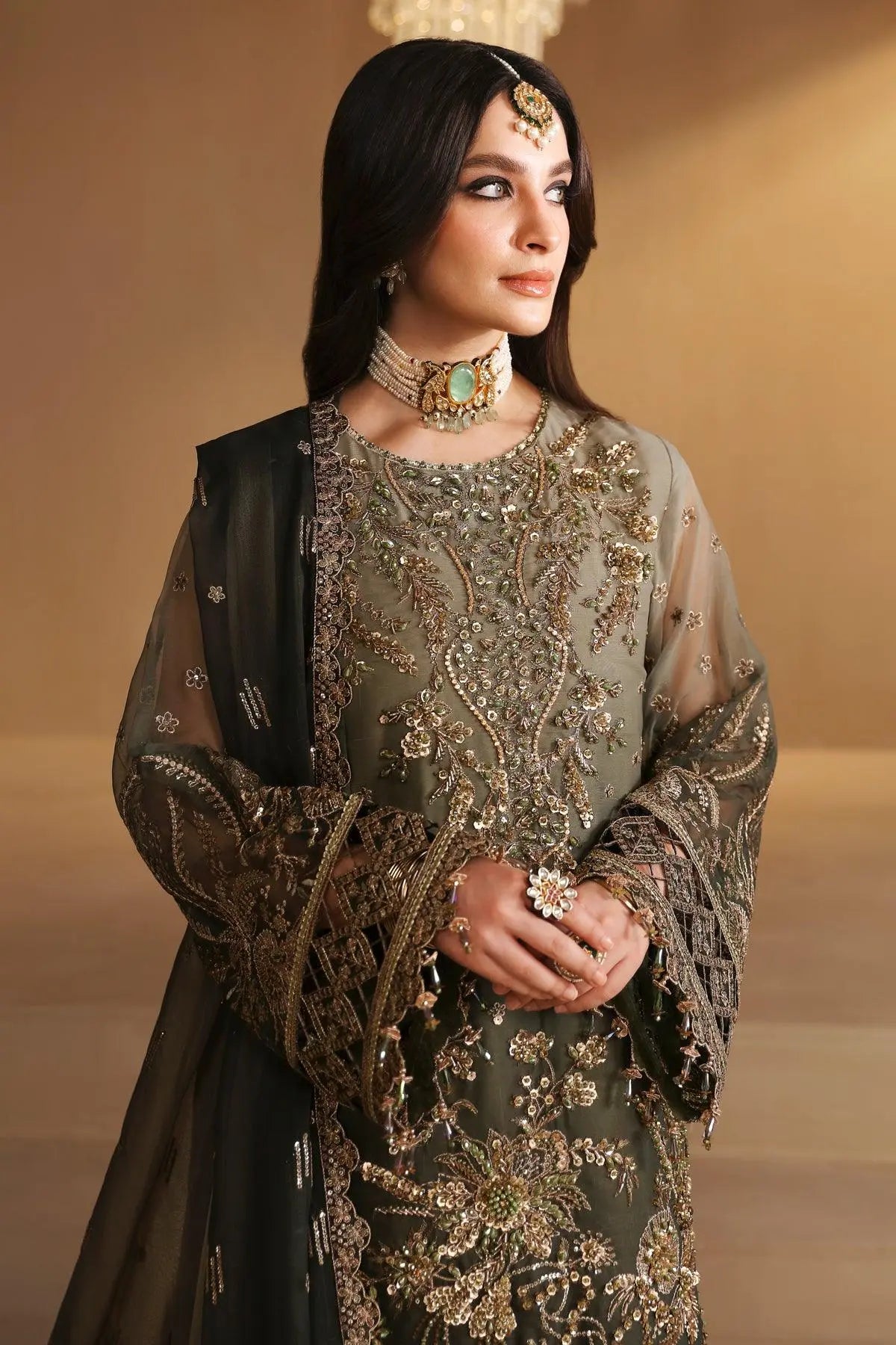 Jiya is an olive green two-toned chiffon shirt adorned with dull gold hand embroidery, sequins, and modern motifs on the front and back. It also features patterned sleeves and intricate handwork on the daman border. This ensemble exudes grace, paired with tonal trousers and a chiffon dupatta with a sequined border.