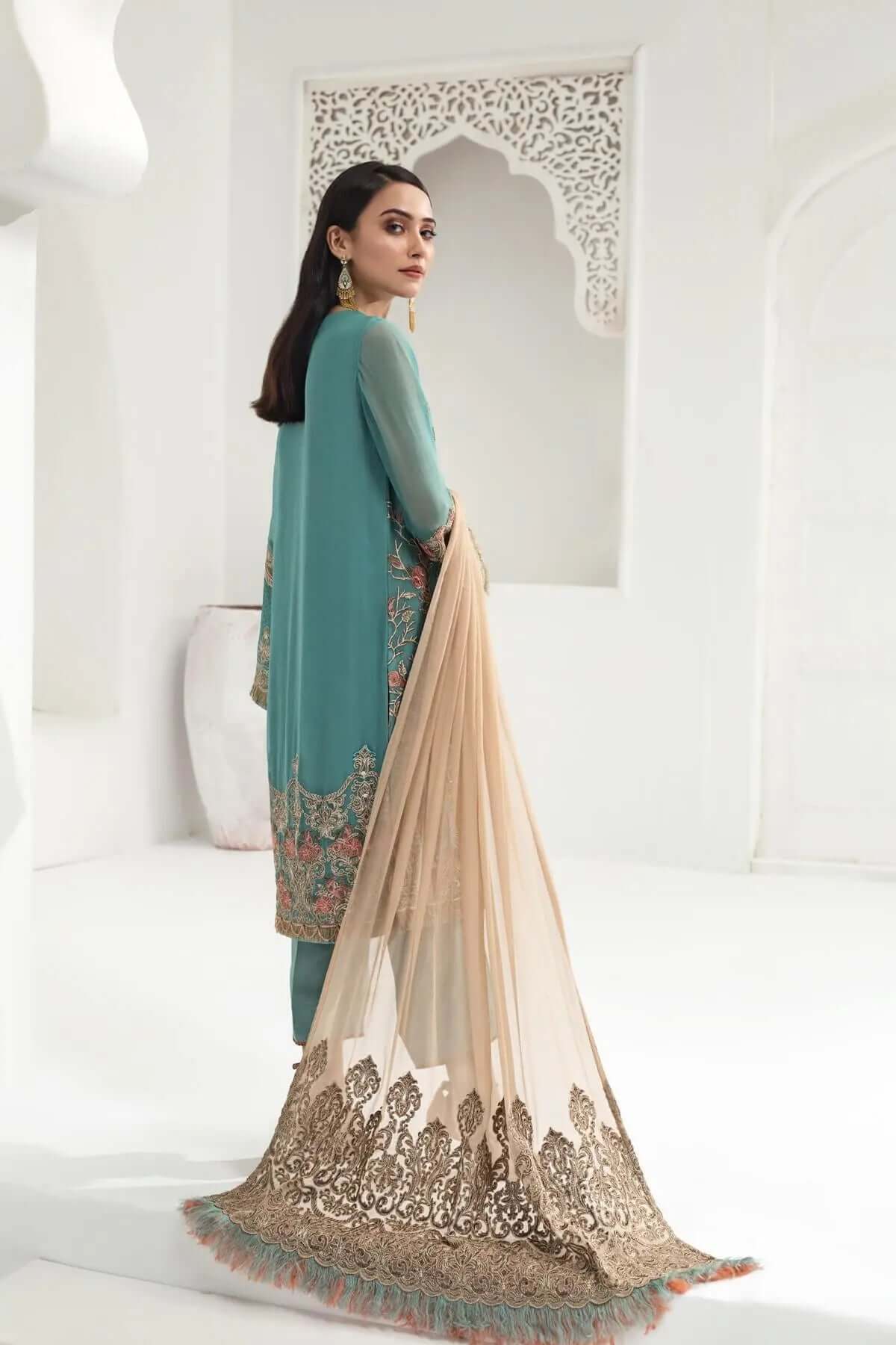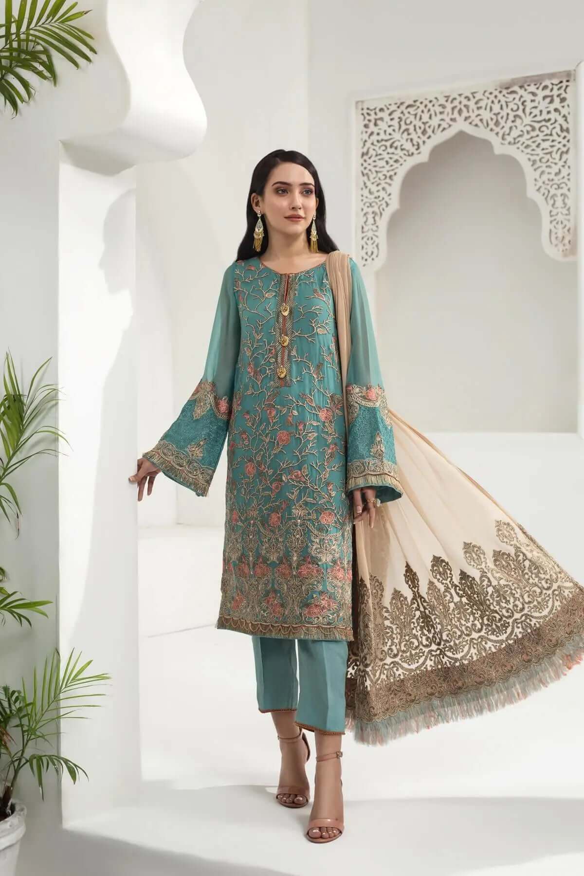 - Stitched includes Shirt, Lining, Dupatta and Trouser all embellished as shown in pictures.
